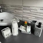 The spacious Casa Di Afi, Perfect For 4 - Kitchen - Parking - Netflix Apartment provides a balcony furnished with a sofa set, along with modern amenities like a flat-screen TV with satellite channels. Featuring a bidet, a bath, and a shower, a bathroom provides a hair dryer and bath sheets.